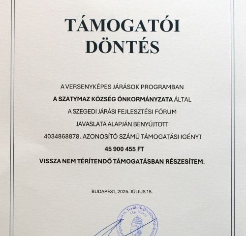 A megyében 54 település kapott fejlesztési támogatást a térségek közötti különbségek csökkentésére. A Versenyképes Járások Program keretében Szatymaznak 45 millió forint jutott. A támogatói okiratot a Csongrád-Csanád Vármegyei Kormányhivatal dísztermében, kedden adták át a települések vezetőinek.