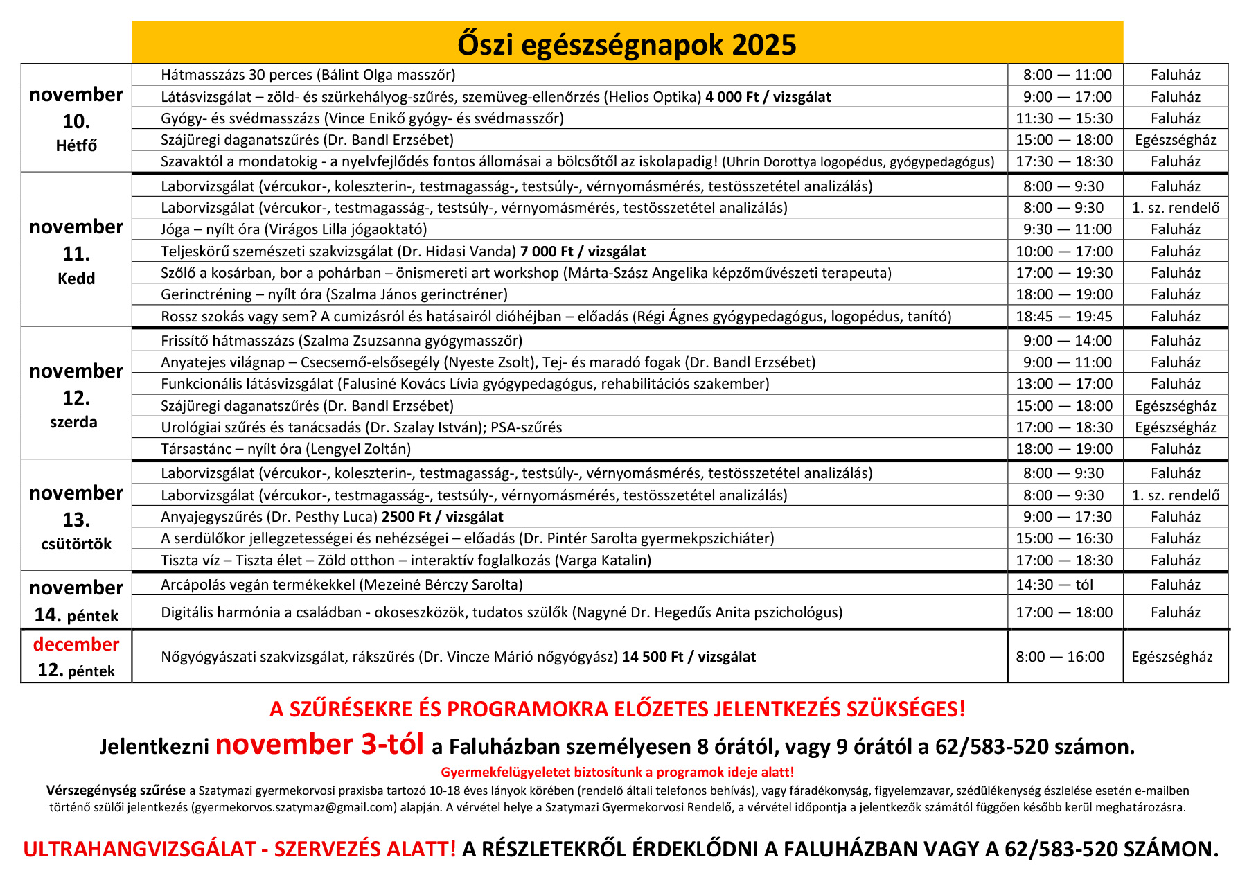 A SZŰRÉSEKRE ÉS PROGRAMOKRA ELŐZETES JELENTKEZÉS SZÜKSÉGES!