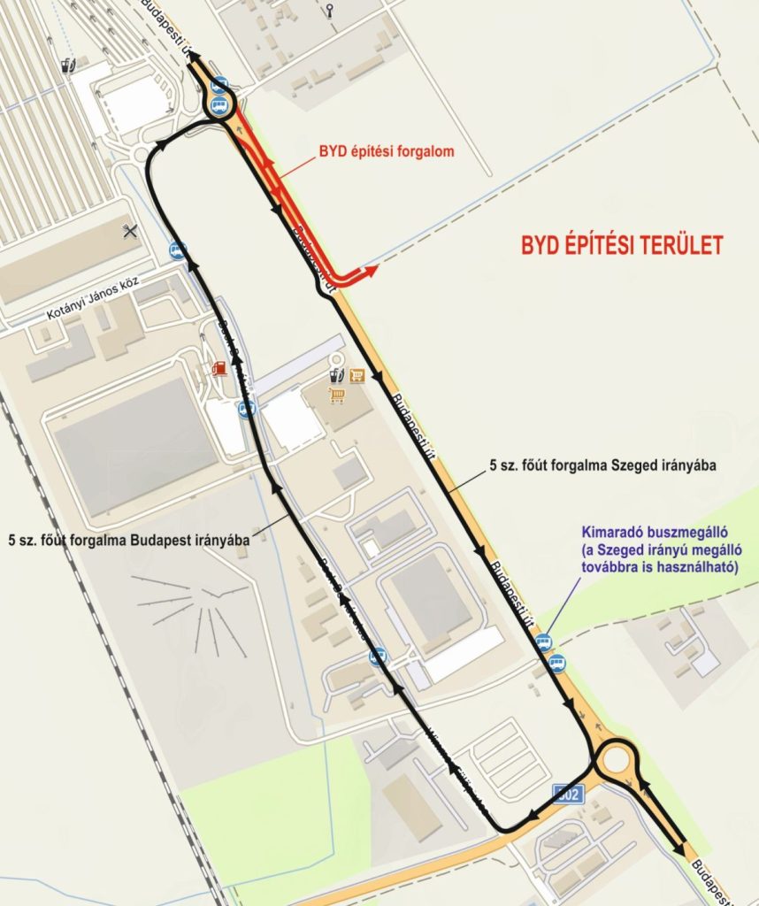 Az 5-ös úton új körforgalmi csomópont épül, ezért november 19-étől 30-áig a főút egyirányú utca lesz a nagybani piac és az 502-es út körforgalmai között, az M43 autópálya felől Szeged felé. Az ellenkező irányú, Budapest felé haladó forgalom terelő úton halad a Wimmer Fülöp és a Back Bernát utcákon.