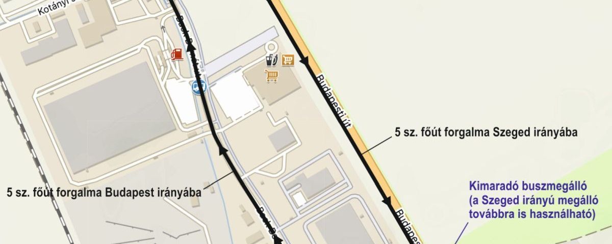 Az 5-ös úton új körforgalmi csomópont épül, ezért november 19-étől 30-áig a főút egyirányú utca lesz a nagybani piac és az 502-es út körforgalmai között, az M43 autópálya felől Szeged felé. Az ellenkező irányú, Budapest felé haladó forgalom terelő úton halad a Wimmer Fülöp és a Back Bernát utcákon.